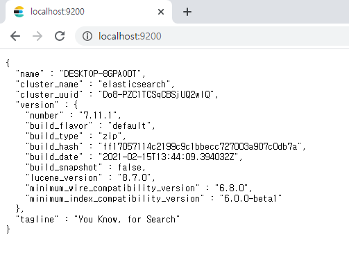 정상적으로 구동되면 브라우저를 열고 localhost:9200으로 접속해봅니다.
