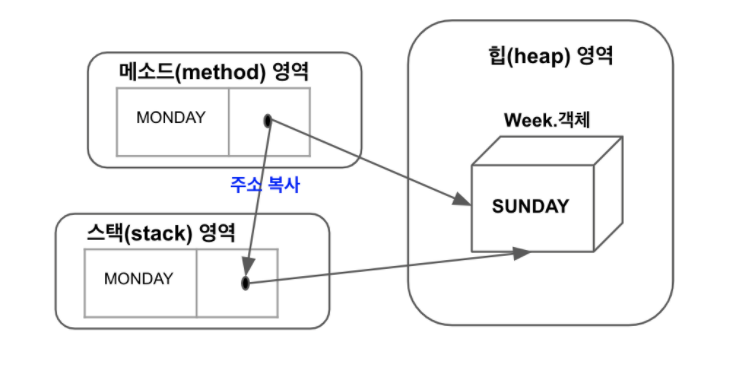 열거 상수도 객체이며, 위에서 정의한 열거 타입 Week의 경우 7개의 객체가 생성된다.